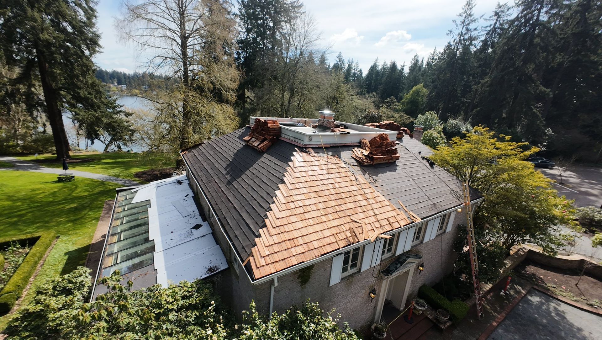 We tore off the existing roof down to the skip-sheathing substrate. We addressed any rot to ensure the new roof would have a solid foundation that will last. We installed shakeliner underlayment, new sheet metal flashings, and a high quality wood shake roofing system.